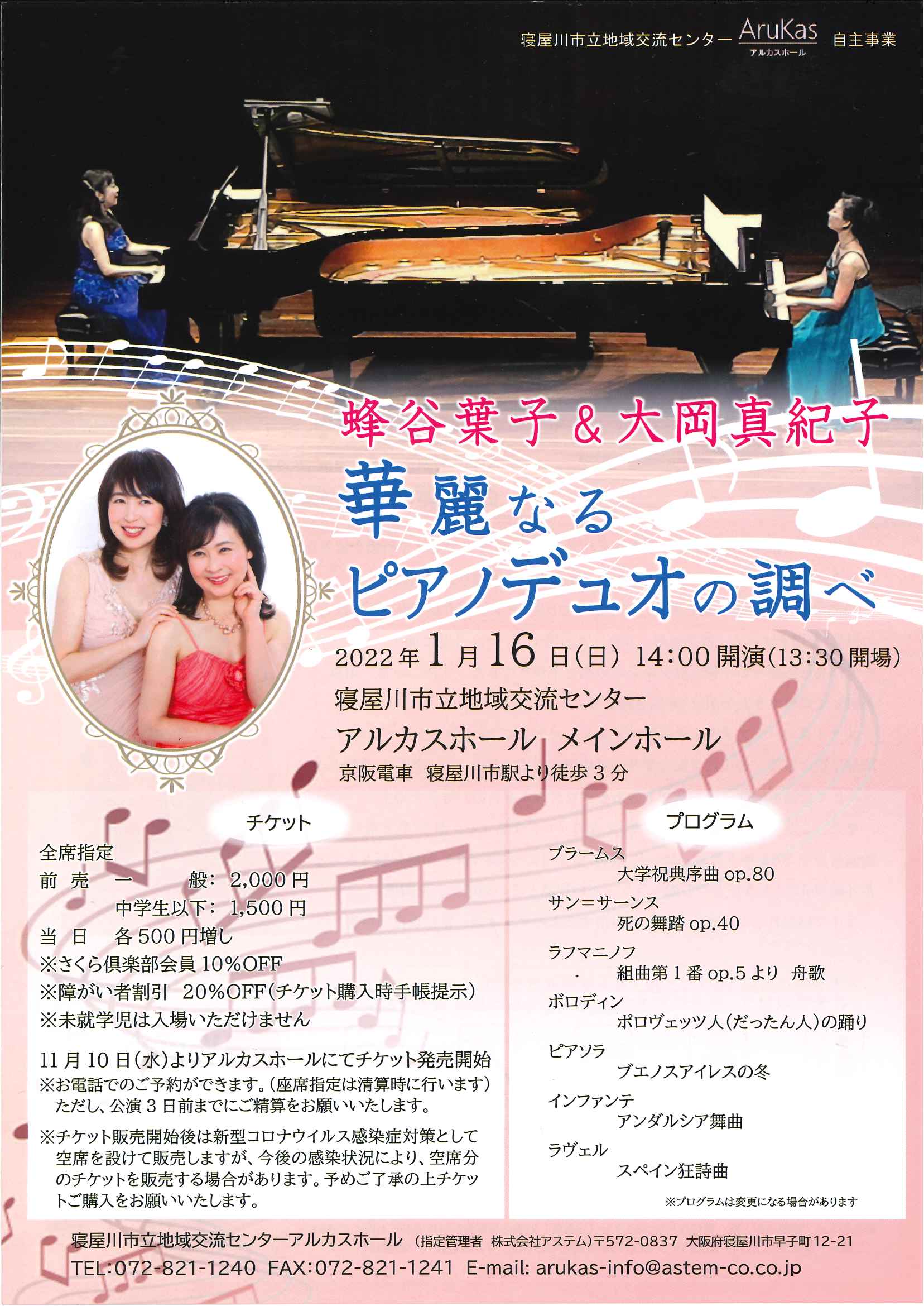 響きのよいアルカスホールで、2台のスタインウェイフルコンサートピアノが奏でる至高のデュオをお届けします。