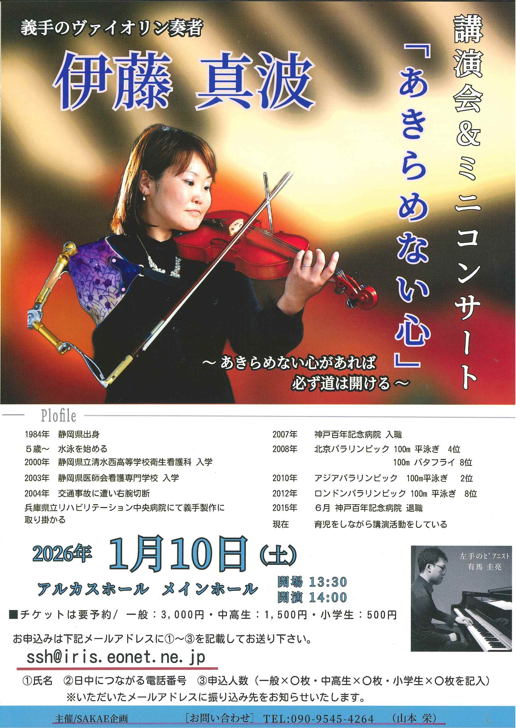 | 義手のヴァイオリン奏者 伊藤 真波 講演会&ミニコンサート「あきらめない心」 |