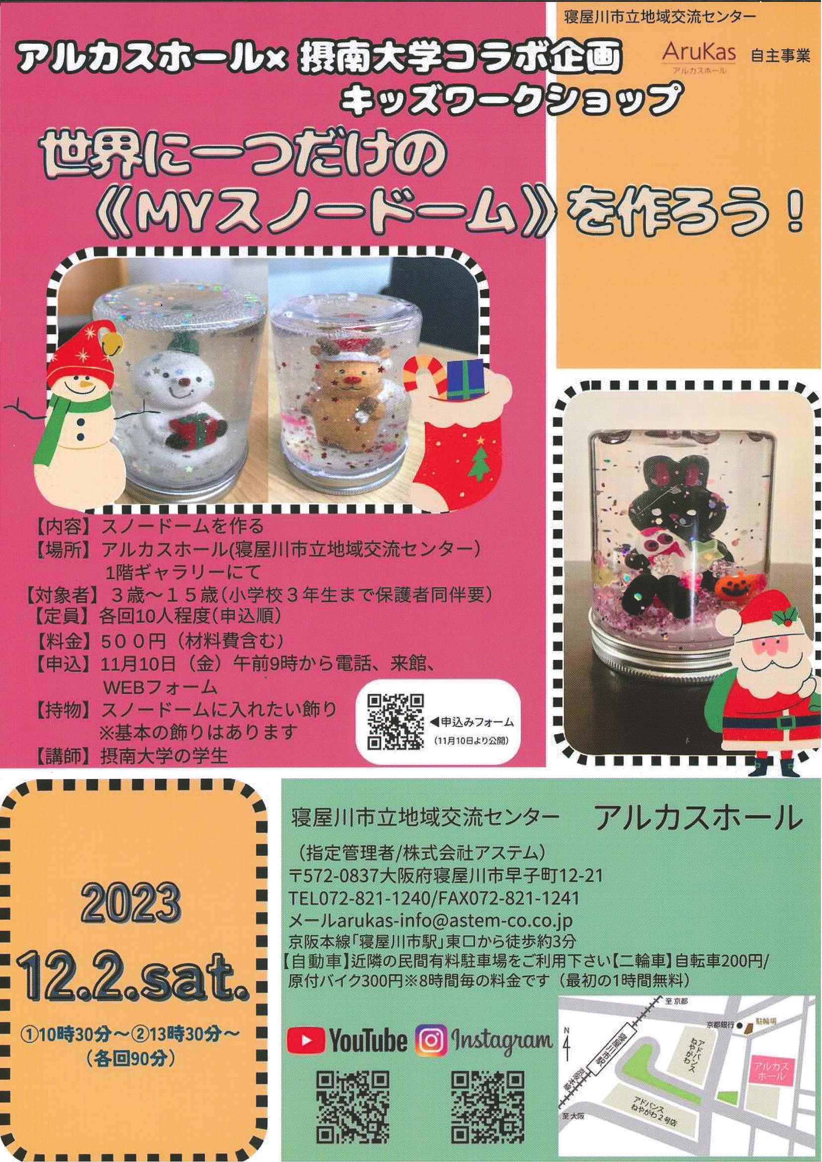 【日時】2023年12月2日(土) ①10:30~ ②13:30~(各回90分) ご好評につき、①②どちらも定員に達しました。 【場所】ギャラリー 【対象者】3歳~15歳(小学3年生まで保護者同伴要) 【定員】各回10名程度(申込順) 【料金】500円(材料費) 【持物】スノードームに入れたい飾り ※基本の飾りはあります。 【講師】摂南大学の学生 |