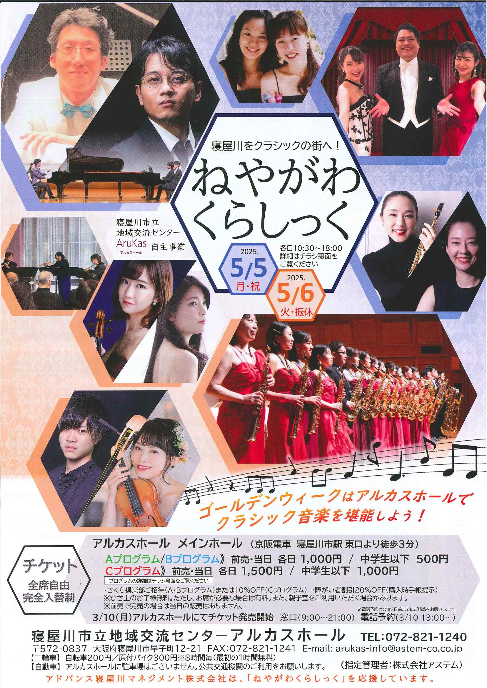 2025年5月5日(月祝)/5月6日(火振休) 【開場】メインホール・ギャラリー(全席自由) 【時間】各日10:30~16:00 【前売り券・当日券】 ♦Aプログラム/Bプログラム 各日1,000円(中学生以下500円) ♦Cプログラム 各日1,500円(中学生以下1,000円) プログラム等の詳細はチラシをご確認ください。
