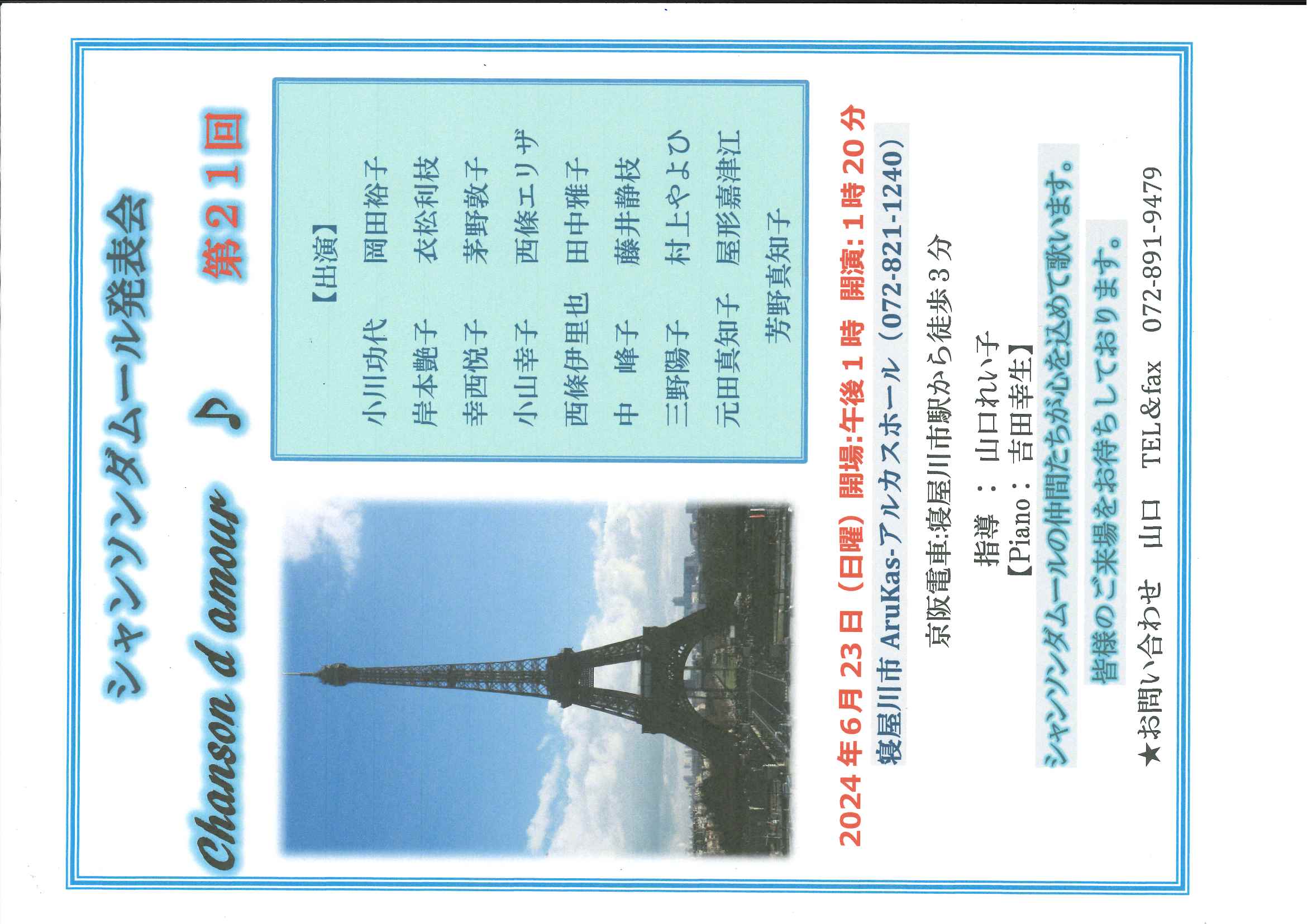 生徒募集中 【会場】練習室 【時間】火曜日/月3回(子供連れ可) ①13:30~14:40 ②15:10~16:20 |