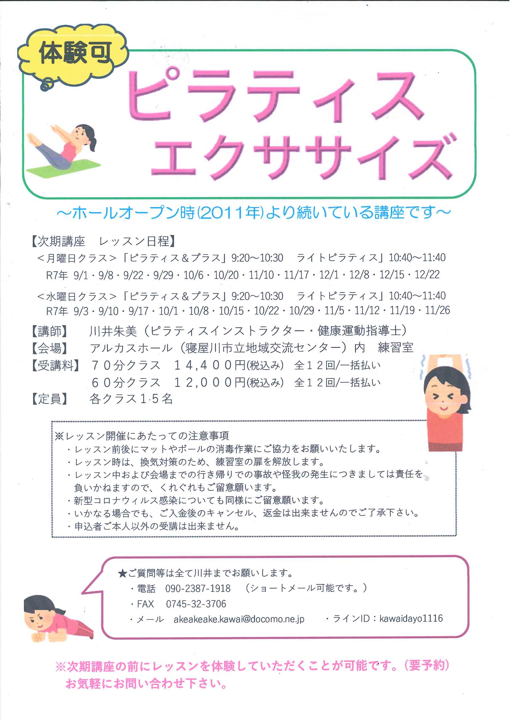 生徒募集中 【会場】練習室 【時間】★月曜クラス Ⓐピラティス&プラス 9:20~10:30 Ⓒライトピラティス 10:40~11:40 ★水曜クラス Ⓑピラティス&プラス 9:20~10:30 Ⓓライトピラティス 10:40~11:40