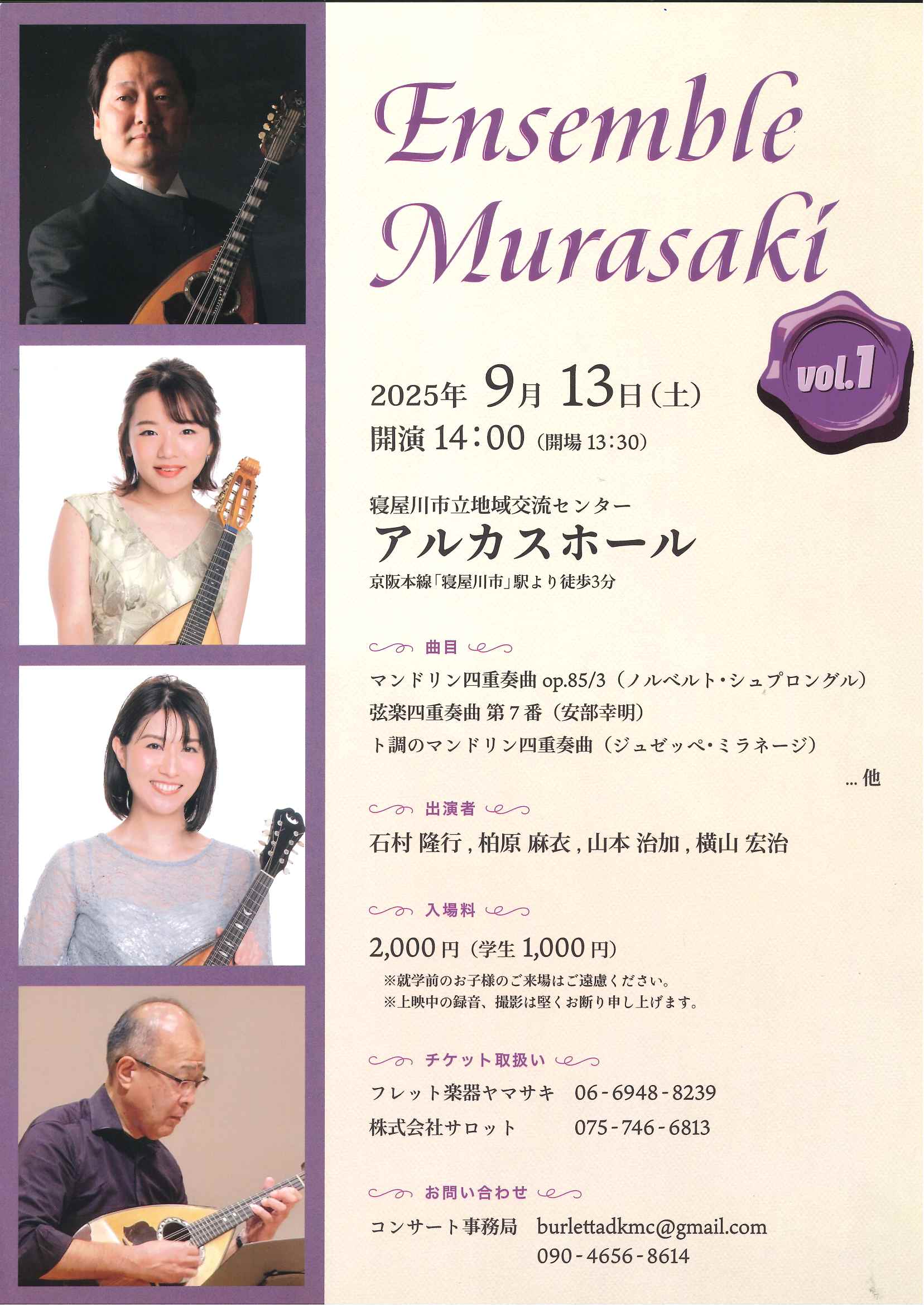 | ENSEMBLE MURASAKIコンサート(マンドリン四重奏) |