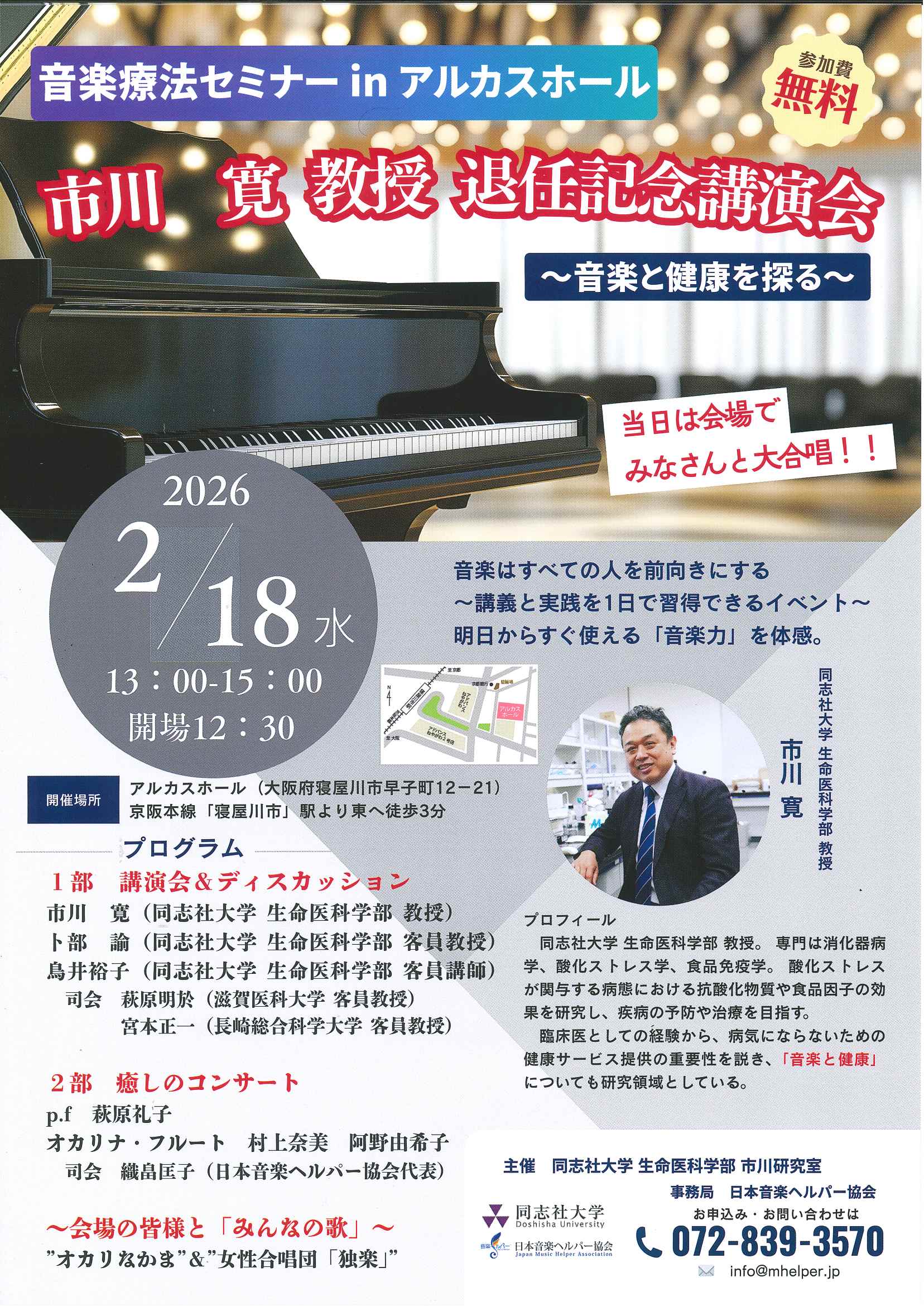 | 音楽療法セミナーinアルカスホール 市川 寛 教授 退任記念講演会~音楽と健康を探る~ |