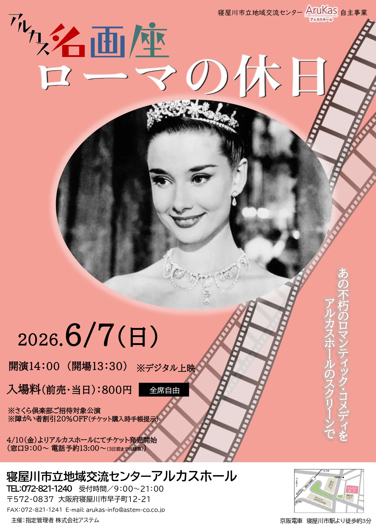 【会場】メインホール(全席自由) 【開演】14:00(開場13:30) 【料金】前売・当日:800円 ※さくら倶楽部ご招待事業 ※障がい者割引20%OFF(購入時手帳を提示) 【作品】ローマの休日 ※デジタル上映 |