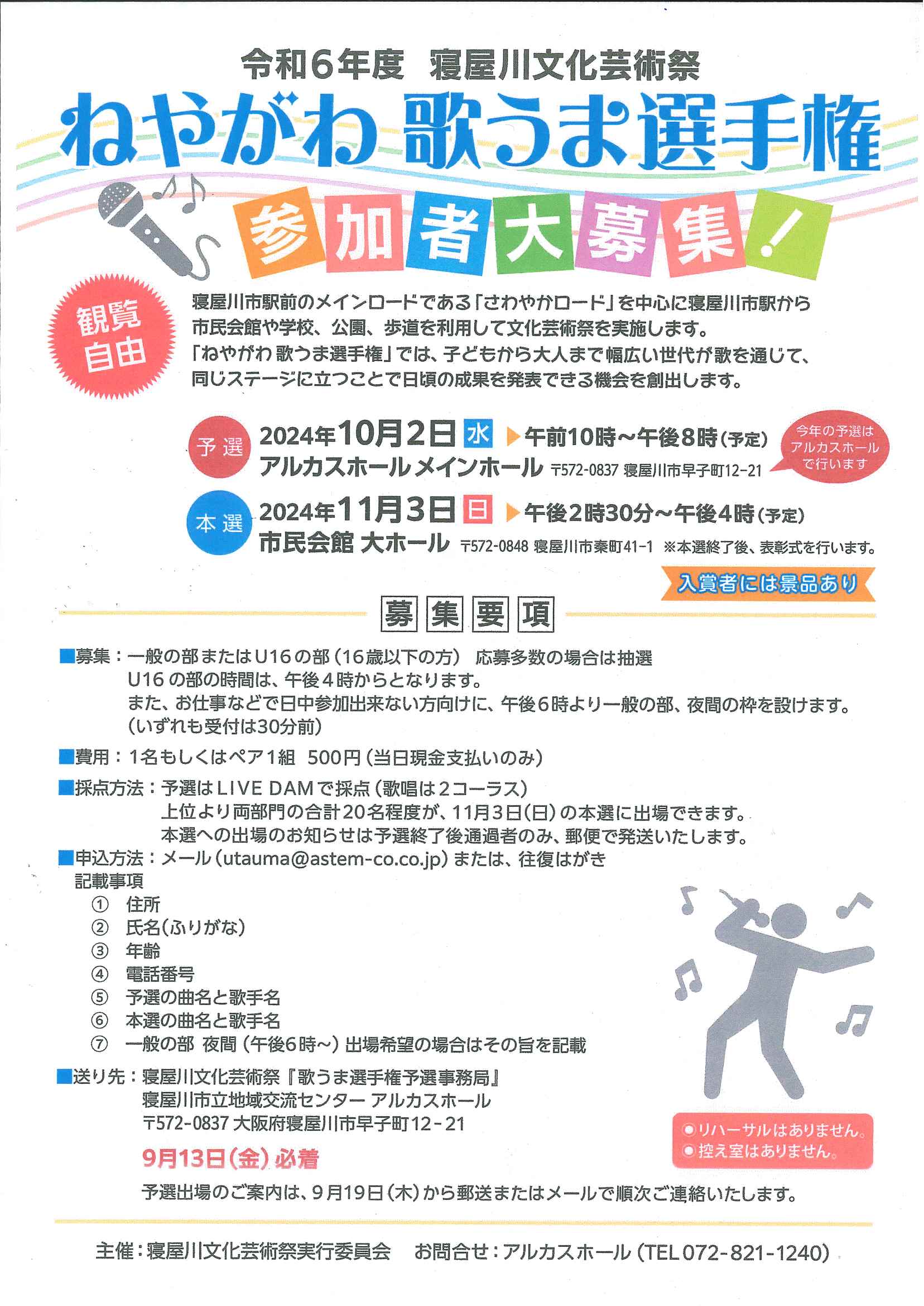 令和6年寝屋川文化芸術祭 ねやがわ歌うま選手権【参加者大募集】